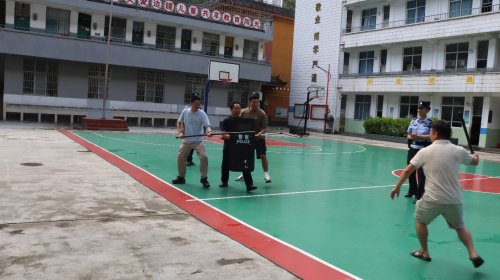 “注意!‘可疑人员’试图翻越校园围墙,立即启动处置响应!”随着民警的指令,校园防恐防暴应急处突演练正式拉开帷幕——民警先向师生讲解“预警、疏散、防护、反击”四步处置法,再模拟“歹徒持械闯校”“校园防踩踏”两类高频场景。在“应对歹徒持械闯校”场景中,教师生用课桌构筑临时防护屏障,校园安保人员持防暴盾牌、钢叉与“歹徒”周旋,民警迅速到达、快速处置;在“校园防踩踏疏散”场景中,教学生“双手护胸、弯腰屈膝、顺人流移动”的自救动作,让安全知识从“听懂”变成“会用”。演练结束后,民警与学校负责人一起开展“全覆盖”安全检查。并对辖区的商铺、烧烤摊、娱乐场所进行重点检查,督促落实不向未成年人出售烟酒、不得让未成年人进入娱乐场所相关规定和要求,现场督促整改隐患问题3个,用“演练+检查”双举措筑牢校园物理安全防线。